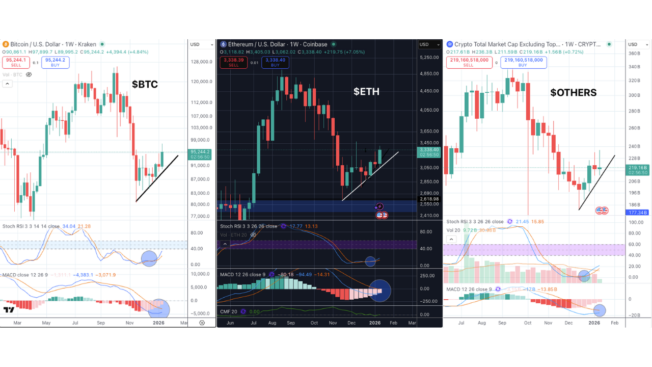At the time of writing, 4 hours before market close, BTC is up about 5% on the week, $ETH is up 7%, and $OTHERS (altcoins - top10) is up 0.6%. We see the majors performing, and that’s important for overall market strength. On Thursday, Bitcoin had it’s highest Daily buy volume in 10 months. All 3 charts have Weekly bullish crosses on the RSI and all are approaching bullish crosses on the MACD. Higher lows are continuing to be set. The key is we need to break through those 40 levels on the RSI to really get us out of Bear territory and then we want to get through 60 to turn us into full Bulls. We also want to see confirmation on the MACD cross. Let’s see some follow through this upcoming week!